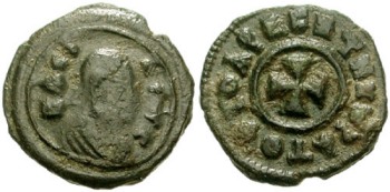 | BMC 90 | Kings of Axum. Ezanas. Circa 300-350 AD. AE15mm. Struck after his conversion to Christianity in 330 AD. BACI LEYC, draped bust right in headcloth / +TOV TO APECH TH XWPA (May This [the cross] Please the Country), small cross in circle. Munro-Hay 52; BMC Aksum 90. | Text | Image |