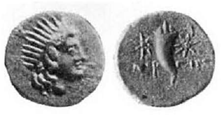 | Anokhin 195 | Gorgippia, Bosporos, AR drachm, 125-100 BC. Radiate head of Helios right / ΓOΡ-ΓIΠ to left and right of cornucopiae, a star in each upper field. Anokhin 195 (this coin); Stahnspavskov 926. | Text | Image |