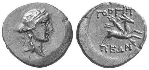 | BMC BlackSea 985 | Gorgippia, Bosporos, AR Drachm, 18mm. 100-75 BC. Laureate head of Apollo right / ΓOΡΓIΠ-ΠEΩN above and beneath stag running right; thyrsus behind. Anokhin 197; BMC Black Sea 985; MacDonald 167; Sear Greek II 3619. | Text | Image |