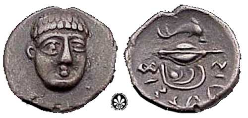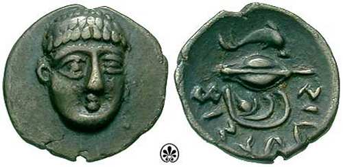 | BMC 4 | The Phistelians, Campania, AR Obol. Circa 380-350 BC. . Youthful male head facing slightly right / Oscan legend; barley-corn, mussel-shell and dolphin. | Text | Image | Text | Image |