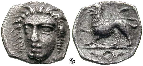 | HN Italy 619 type 1 | Phistelia, Campania, AR obol, ca 325-275 BC. 11 mm, 0.59 g. Head of nymph facing front, slightly left. / Lion crouching left, coiled serpent below. HN Italy 619, type 1; Sambon 844; Hoover HGC 1, 505; Drouot (1927) 101-103. | Text | Image |