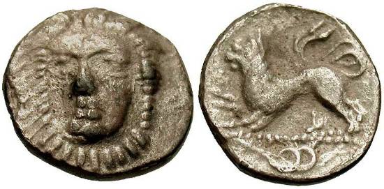 | HN Italy 619 type 2 | Phistelia, Campania, AR obol, ca 325-275 BC. 11 mm, 0.59 g. Head of nymph facing front, slightly left. / Lion crouching right, coiled serpent below. HN Italy 619, type 2; Sambon 847. | Text | Image |