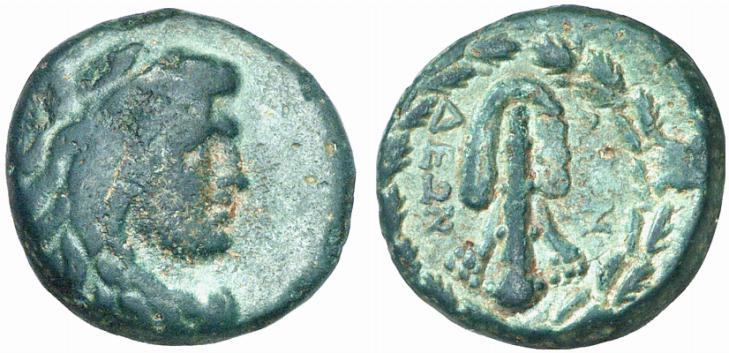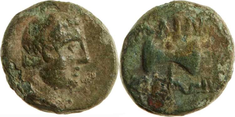 | SNG Cop 21 | Alinda, Caria, AE10. Civic issue, ca. 300-100 BC. 1.0 g. Laureate head of Apollo right. / AΛIN ΔE-ΩN above and beneath bipennis. SNG Cop. 21 (this coin)-22; SNG Ashmolean XI, 13; Waddington 2124; Mionnet III, 46. | Text |  |