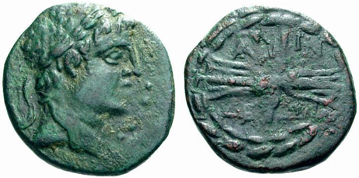 | BMC 8 | Alinda, Caria. AE19, 4.58 gr. 145-130 BC. Youthful laureate male head right / AΛINΔEΩN above and beneath winged thunderbolt, all within laurel wreath. BMC 8; Mionnet Supp. VI, 46. | Text |  |