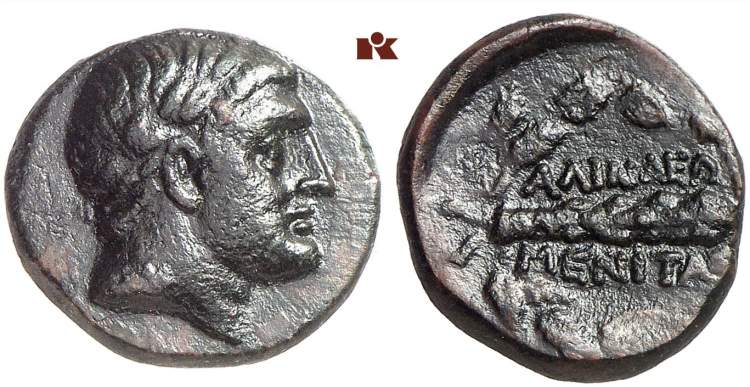 | Karl 393 | Septimius Severus AE39 of Alinda, Caria. (AY KAI Λ CE CEVHΡOC ΠEΡT C CE), laureate, draped, cuirassed bust right / (EΠI AΡ KOΡ MENIΠΠOY AΛ BOYΛH) AΛINΔEΩN, Herakles and the horses of Diomedes: Herakles naked, standing right, resting right foot on a horse on ground, raising club towards another horse rearing up before him. Karl 393 (Lanz auction 120, Karl Caria collection). | Text |  |