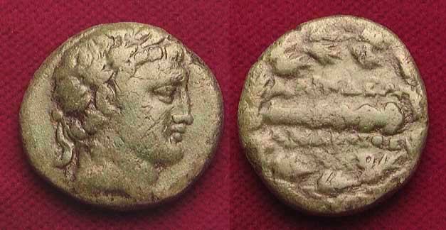 | SNG Fitz 4666 var | Alinda, Caria, 2nd century BC. AE16. Laureate, young male head right / AΛINΔEΩN ANΔΡOXOΣ, Club within oak wreath. SNG Lewis 964 var (magistrate); Imhoof KM 2-3 var (ditto); SNG Fitz. 4666 var (ditto). Lowen B2154. | Text |  |