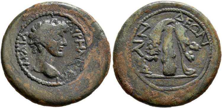| Leu 18, 1988 | Marcus Aurelius AE22 of Alinda, Caria. AD 139-161. 5.8 g. Struck ca AD 147-161. M AIΛ AYΡHΛIOC KAI, bare head right. / AΛINΔEΩN, club draped with lionskin. Unpublished. Leu Numismatik Web Auction 18, Lot 1988, Dec. 2021. | Text |  |