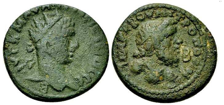 Ziegler 294Plautilla AE19 of Anazarbus, Cilicia. Dated local year 221, AD 202-203. ΦOY ΠΛAYTIΛΛA CE, draped bust right, hair in bun / ANAZAΡBEΩN NEΩKOΡΩN ET AKς OΛYMΠIA. Ziegler Kaiser 294; Ziegler Kilikien 1030; SNG Levante 1411; Lindgren I 1434. Text Image G&N 5, 197 Geta, AE28 of Anazarbus, Cilicia. AD 209-211). 12.9 gr. CEΠTIMIOC ΓETAC KAI, bare-headed, draped and cuirassed bust right / CEOYΡ ANT ANAZ MHTΡ NEΩKOΡΩN (HT of MHTΡ ligate) around and below, date ET ZIC in three lines in left field, Zeus seated left, holding Nike and sceptre. Gitbud and Naumann, 5, 197, apparently unpublished. Text Image Ziegler 303 Geta AE30 of Anazarbus, Cilicia. 209-212 AD. POPLIOC(!) CEΠTIMIOC ΓETAC KA, laureate, draped bust right / ANAZARBOY MHTROPOLEWC, Γ-B across fields, in ex: ET ΓKC CEOYHΡEIA ΦIΛAΔEΛΦEIA; Prize urn on table. Text Image SNG Levante 1414 Macrinus. 217-218 AD. AE37mm Medallion of Anazarbos, Cilicia. Dated Pompeian-Cilician Era 235 = 217 AD. Laureate, draped, and cuirassed bust right / Nike walking left; date across field, G B to upper right, date across field. Ziegler 341/1. Text Image SNGCop 44 Diadumenian, Caesar, AE30 of Anazarbus, Cilicia. 217-218 AD. M OΠ ANTΩNI ΔIAΔOYMENIANOC K, bare-headed, draped and cuirassed bust right / ANAZAΡBOY MHTΡOΠOΛE ΓB, Nike driving biga right. SNG Cop. 44 Text Image Ziegler 323 Diadumenian, AE23 of Anazarbus, Cilicia. 217-218 AD. 6.6g. M OΠ ANTΩN ΔIAΔOYMENIANOC, draped bust right / (ANAZAΡBOY MHTΡOΠOΛ, Γ-B across fields, Nike walking right, foot on globe, inscribing shield. Ziegler (Kaiser) 323. Text Image BMC 19 Elagabalus, AE28 of Anazarbos, Cilicia. AD 221-222. AY K M AYΡ ANTΩNEINOC CEB, bust right, wearing the crown and robe of a Demiurgos. / ANAZ ENΔOX MHTΡOΠ TΡOΠ A M K Γ B ET MC around, in fields and below (BG retrograde), emperor standing left by trophy with flaming altar at its base. BMC 19; Ziegler Kaiser 461-463; Ziegler Kilikien 1060; Sear GIC 3089; SNG von Aulock 5488. Text Image BMC 21v Anazarbus. Elagabalus AE28 (3 Assaria). AVT K MA ANTΩNEINOC CEB, laureate, draped and cuirassed bust right / AΔΡIANIOC OI KOVMENIKOC, A M K in field, ANAZAΡ in ex, prize urn on four-legged square table. Text Image SNG Lev. 1425 Elagabalus, AE27 of Anazarbus, Cilicia. AY K M A-Y ANTΩNEINOC CE, laureate, draped and cuirassed bust right / ANAZAΡBOY MHTΡO AMK ΓB (below), She-wolf standing right, head turned back, suckling twins Romulus and Remus, tree behind. Ziegler (Kaiser...) 403ff; Waddington 4123; SNG France II 2062; SNG Levante 1425. Text Image SNG Lev Supp 330 Elagabalus, AE31 of Anazarbus, Cilicia. AVT K MAVΡ ANTΩNEINOC, laureate head right / ANAZAΡBOY MHTΡOΠOΛ, AMK above, ΓB below, three prize-crowns on base. SNG Levante suppl. 330 (this coin). Text Image Ziegler 357 Elagabalus, AE18 of Anazarbus, Cilicia, 4.9g. AVT K M AV ANTΩNINOC., radiate head right / ANAZAΡBOY, eagle standing facing, head left, wings spread. Ziegler 357. Text Image Ziegler 366A Elagabalus Ae 21 of Anazarbus, Cilicia, 6.7g. AVT K M [AV AN]TΩN[EINOC CEB], Radiate head right / ANAZAΡ MHTΡOΠ around, Γ B in left field, A M K in right field, Dionysos standing facing, head left, holding kantharos and thyrsos, panther at foot. Ziegler Kaiser 366A. Text Image Ziegler 371 Elagabalus, AE22 of Anazarbos, Cilicia. AD 218-222. AYT K M AY ANTΩNEINOC CEB, radiate head right. / ANAZAΡBOY MHTΡOΠO AMK around, head of Zeus right, hair bound in a taenia. Γ-B across fields. Ziegler Kaiser 371; Leypold II 2242. Text Image Ziegler 378 Elagabalus and Julia Paula, AE27 of Anazarnbus, Cilicia, AD 220-222. 9.68 g. AYT K M A ANTωNINOC CE I ΠAYΛA CE, radiate, draped and cuirassed bust of Elagabalus right facing diademed and draped bust of Julia Paula left. / ANAZAΡBOY MHTΡOΠOΛ A M K Γ B, hexastyle temple and tetrastyle temple. Ziegler 378; SNG Levante Supp. 336; SNG Pfalz 168; Kapossy 131; Bern 92.64. Text Image Ziegler 395 Elagabalus, AE27 of Anazarbos, Cilicia. 15.48 g. AYT K M AYΡ ANTΩNEINOC CEB, laureate, draped and cuirassed bust left. / ANAZAΡBOY MHTΡOΠOΛO B-Γ, AMK, unruly quadriga facing, carrying baetyl surmounted by eagle. Ziegler Kaiser 395; Waddell 1, 479; Ziegler Prestige pl. 11, 99. Text Image Ziegler 396 Elagabalus, AE31 of Anazarbus, Cilicia, AYT K M AYΡ ANTΩNEINOC CEB, laureate, draped, bust right / ANAZAΡBOY MHTΡOΠ, Emperor riding right, holding sceptre and raising hand. A M K, Γ B in fields. Ziegler 396; SNG Pfalz 174. Text Image Ziegler 401 Elagabalus, AE29 of Anazarbus, Cilicia. 218-222 AD. AYT K M AYΡ ANTΩNEINOC CEB, laureate, draped bust left / ANAZAΡ MHTΡOΠO, A M K above, Γ B below, three prize crowns on a table. Ziegler 401; Ziegler Kilikien 1051. Text Image SNG Levante Supp 337 Julia Paula AE 25mm of Anazarbus, Cilicia. Veiled, diademed, and draped bust right / River-god Pyramus reclining left, holding reed and cornucopiae; B Γ to left. Text Image SNG Levante Supp 338 Julia Paula AE 25mm of Anazarbus, Cilicia. Veiled, diademed, and draped bust right / Capricorn right on globe; Γ B above. SNGFr 2075. Text Image SNG Levante 1440 Julia Paula AE 26mm of Anazarbus, Cilicia. Veiled, diademed, and draped bust right / Capricorn left on globe; G B to right. SNGFr 2075v. Text Image Ziegler 438 Julia Paula, AE27 of Anazarbos, Cilicia. AD 219-222. IOYΛIAN KOΡNHΛIAN ΠAYΛAN, draped bust right. / ANAZAΡBOY MHTΡO around, ΓB in left field, AMK below, horse standing right, raising left foreleg. Ziegler 438; Paris 1965.1066; SNG France II, 2077. Text Image SNG Levante 1450 Severus Alexander, AE32 of Anazarbos, Cilicia. AD AD 229-230. 21.45 g. AYT KA M AYΡ CEOY AΛEΞANΔΡOC, laureate, draped and cuirassed bust right. / ANAZAΡBOY beneath aquaduct with five arches and three pediments. The two outer pediments surmounted by an eagle and a lion, a star, Nike and a standing figure with spear to left and right of the central pediment. SNG Levante 1450; Ziegler Kaiser 641; Arslan Anazar