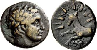 | BMC 39 | Kartheia, Cyclades, AE chalkous, ca, 300-200 BC. 4.57 g. Laureate head of Apollo right. / KAΡΘAI beneath forepart of the hound Sirius right in a circle of rays. BMC 39; SNG Cop 631; Righetti Coll. II, 354. | Text | Image |