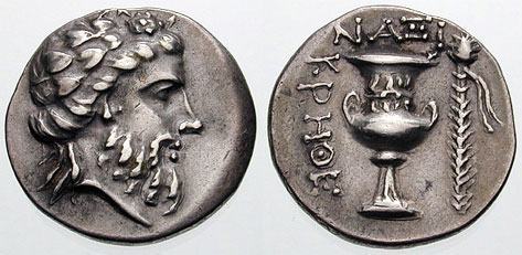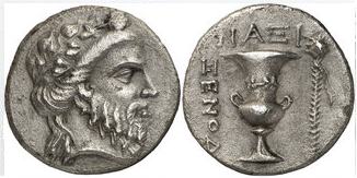 | Nicolet-Pierre 4 | Naxos, Cyclades, ca. 250-220 BC.), AR Didrachm, 7.12g, Magistrate Xenod. Bearded head of Dionysos facing to right, wearing an ivy-wreath / NAΞI, krater with two low handles and a laurel-wreath at the neck, a thyrsos tied with a diadem on right, ΞENOΔ to left. Nicolet-Pierre, 4 (this coin). | Text | Image |