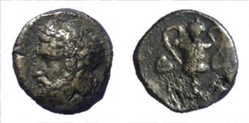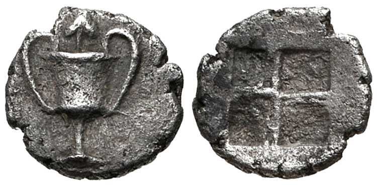 | Sheedy 66 | Naxos, Cyclades. AR Tetartemorion, ca 520-470 BC. AR 6 mm, 0.17 g. Kantharos with bunches of grapes on each handle, ivy leaf above. / Quadripartite incuse square. Sheedy 66; Hoover HGC 627; Borrell p. 134 in NC 1844. | Text | Image |