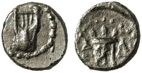 Rosen 232 | Zakynthos, Elis, Peloponnesos. AR drachm, 2.01 g. ca 500 BC. Tripod, dot in crescent to left and right between the feet / Incuse punch with six sections. Coll. Rosen 232; Gardner I, 1. | Text |  |