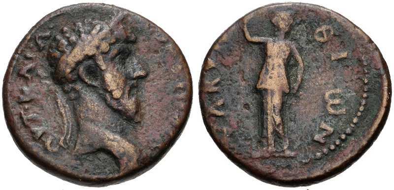 Gardner VIII, 6 | Lucius Verus, AE20 of Zacynthus, Elis. AD 161-169. 5.90 g. AYT KAI L OUHROC, Laureate head right / ZAKUNQIwN, Woman standing facing, raising right hand. Gardner, Zakynthos VIII, 6. | Text |  |