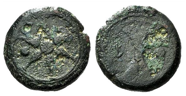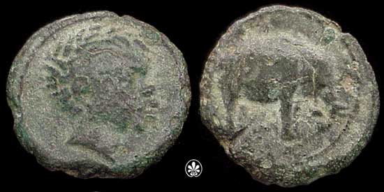 | SNG ANS 39 | Arretium, Etruria. The Chiana Valley. Circa 208-207 BC. AE Quartuncia. Negro head right / Indian elephant standing right, bell around neck; M below. SNG ANS 39-41; BMC 19. | Text |  |