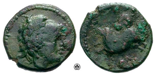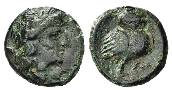 | HN Italy 74 | Uncertain mint of Etruria, late 3rd century BC. AE13, 2.69g. Laureate head of Aplu Apollo right; quiver at shoulder / Owl facing three-quarters right, wings closed. HN Italy 74. | Text |  |