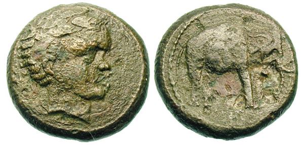 | SNG ANS 40 | Arretium, Etruria. Ca 208-207 BC. AE 19mm (3.66 gm). Negro head right / Elephant standing right; Etruscan M below. | Text |  |
