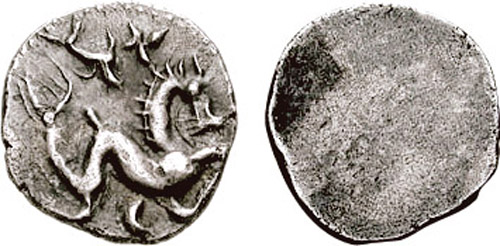 | Vecchi 42 | Lucca(?), Etruria, AR Pentassarion. ca 211-206 BC. Hippocamp right; dolphins above & below, C above / Blank. SNG ANS 18. | Text |  |