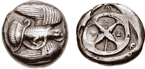 | BCD 116 | Euboia, Chalkis. Circa 465 BC. AR Tetradrachm. Eagle flying right, holding serpent in its beak & talons / Wheel with four spokes; archaic C-A-L (retrograde) in three quarters; all within rough incuse triangle with Y-[A]-L in apices. BCD 116 = Traité I pg. 670, 1054b = Jameson 2070 = Pozzi 1480 (this coin); BMC Central Greece -; SNG Copenhagen -.