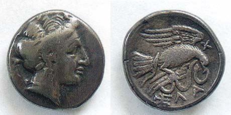 | Sear SG 2482 | Euboea, Chalcis. 340-294 B.C. AR Drachm. Head of Hera right, with hair rolled. / Eagle flying right, carrying snake held in talons and beak. | Text | Image |