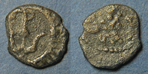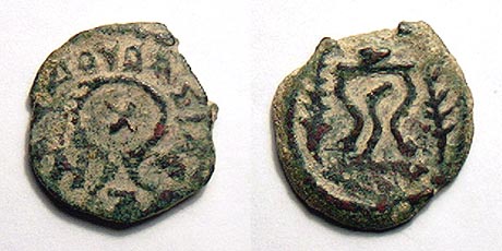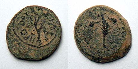 | Hendin 495 | Herod I, 40-4 BC, bronze lepton (half prutah) of 12.0 mm. Small tripod Temple type table. / Crossed palm branches.