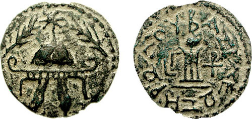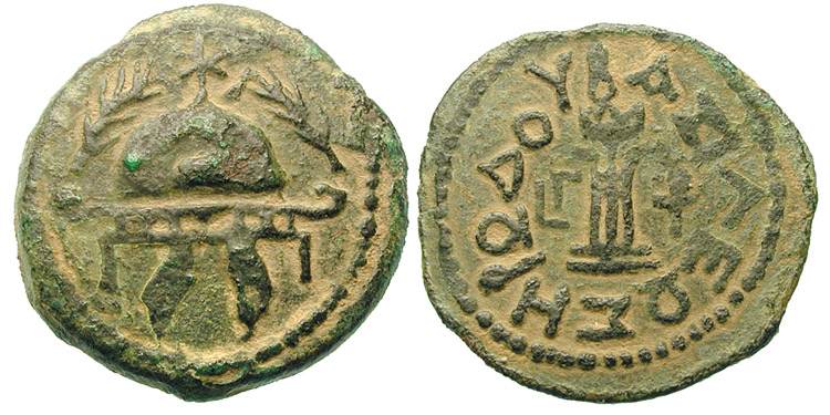 | Hendin 486 | Herod The Great AE 8 Prutot. Tripod, ceremonial bowl (lebes) above; date LΓ = Year 3 = 40 BC, and monogram TP in field left & right; inscription (of King Herod) / Military helmet, star above flanked by two palm-branches. AJC II 1.