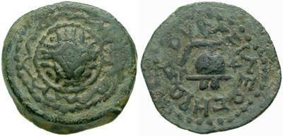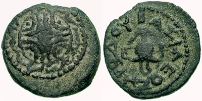| Hendin 488 | Herod I, 40-4 BC, AE 2prutahs of 18.3 mm. Samaria, dated Year 3 which probably corresponds to 40 BC, Herod's third year as Tetrarch, & first as King. Winged caduceus / Poppy.