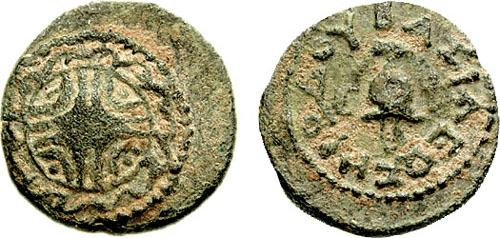 | Hendin 499 | Judaea, Herod I AE Prutah. HΡΩΔOY BAΣIΛEΩΣ / anchor within circle decorated with stylized lily flowers.