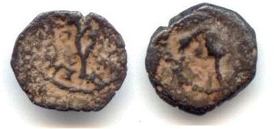 | Hendin 489 | Herod I. 40 BC-4 AD. AE Prutah. 2.94 g. Struck in Samaria, AD 40-37. Aphlaston flanked by date (LΓ = Year 3 = AD 40) and monogram in fields left and right; inscription / Palm branch with leaves(?) on either side. AJC II, 235, 5.
