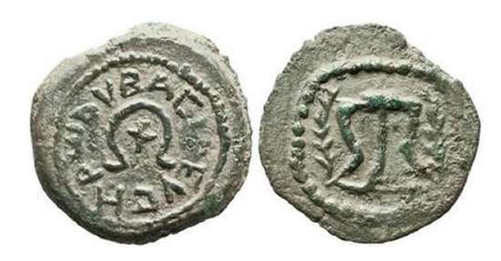 | Hendin 491v | Judaea Herod I 37BC-AD4. AE Prutah 1.7 gr, 17.36/15.41 mm. Hebrew letters around diadem / Crude tripod within in circle.