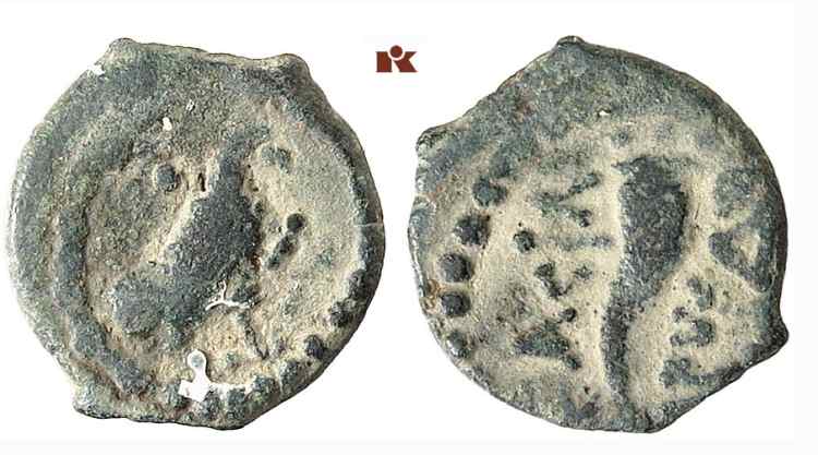 | Hendin 501 | Herod I, AE half prutah. 40 BC-4 AD. Jerusalem mint. 1 g. Eagle, wings closed, standing right. / HΡΩΔ BACIΛ, single cornucopiae. Hendin 501; Hendin Guide 1190; Meshorer 107. | Text | Image |