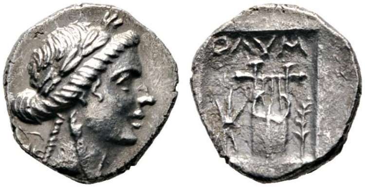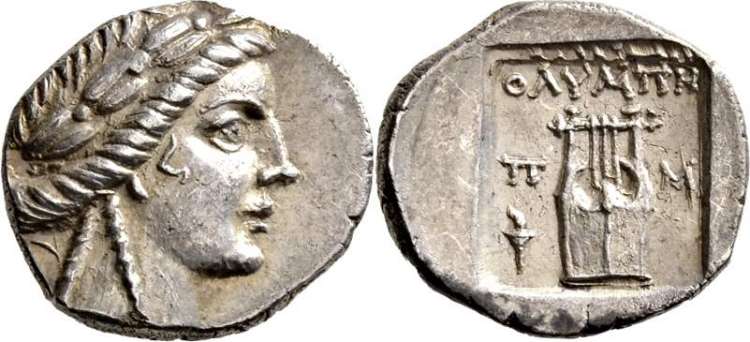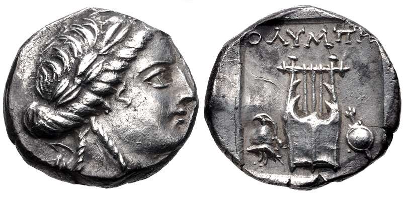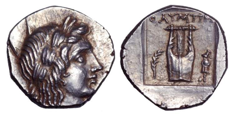 | Boston 2090 | Olympos, Lycia. AR drachm, after 168 BC. 2.56 g. Laureate head of Apollo right. / OΛYMΠH, Lyre, branch to left, trophy to right, all within shallow incuse square. Boston 2090; Troxell LL 45,1-6; Hamburg 201. | Text |  |