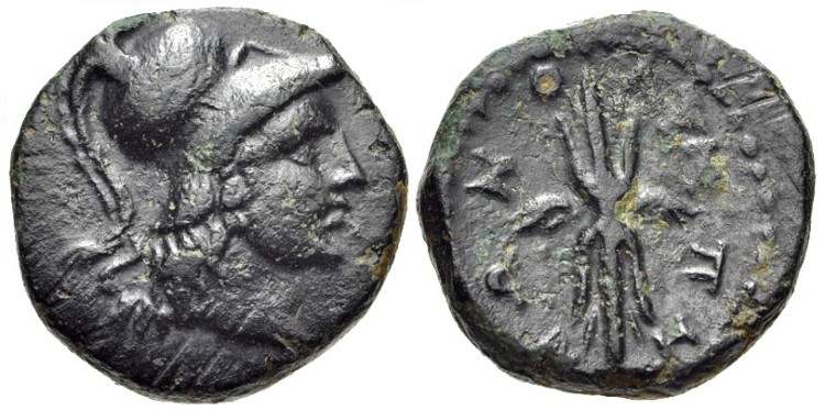 | SNG Cop 112 | Olympus, Lycia, AE 3.51 g. 18.2 mm. ca. 168-81 BC. Head of Athena or Ares right / OΛYMΠHNΩN, Winged thunderbolt. SNG Cop 112. | Text |  |