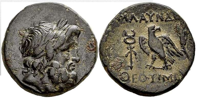| BMC 1 | Blaundos, Lydia, AE21, autonomous issue. 200-0 BC, Magistrate Theotimidos. 6.33 gr. Laureate head of Zeus right / MΛAYNΔ ΘEOTIMIΔO above and beneath eagle standing left, head right, wings spread; caduceus and grain-ear to left and right. Weber 6791; BMC 1-3; Sear Greece 4689; GRPC Lydia 16. | Text | Image |