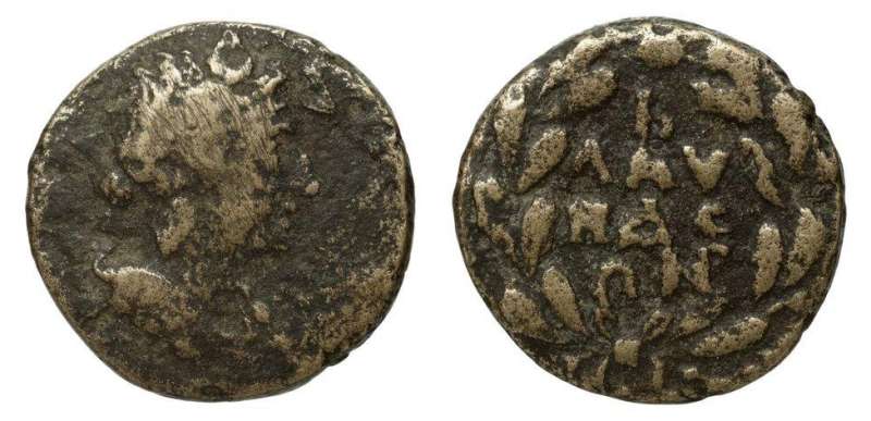 | BMC 43 | Blaundos, Lydia, AE17, Autonomous. Before AD 276. Draped bust of Dionysos right, wreathed with ivy / B-ΛAY-NΔE-ΩN, legend in four lines within laurel wreath. BMC 43; SNG Cop 79; Paris 154; Vienna 30918; Waddington, Voyages (Lydia), 1; Rhousopoulos Coll. 4046; Winterthur 3713-3714; GRPC Lydia 95. | Text | Image |