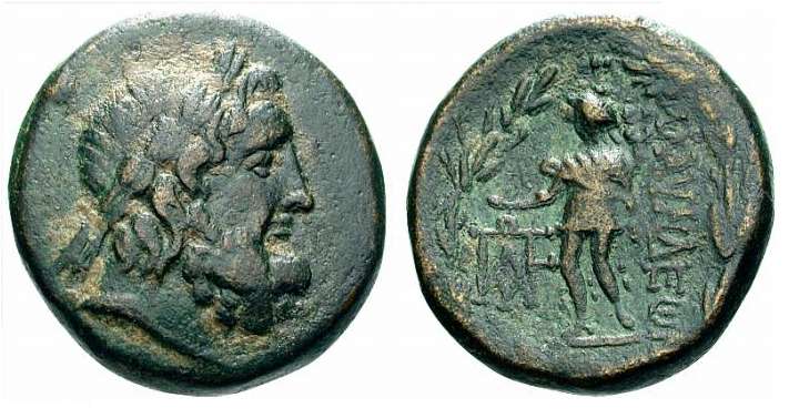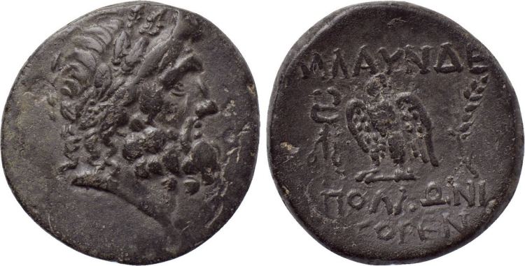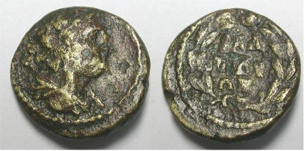 | BMC 23 | Blaundos, Lydia, Autonomous. 200-0 BC. AE22, 8.79 g. Laureate head of Zeus right /MΛAYNΔEΩN, Hermes standing left, petasos on head, holding purse and caduceus, ΩΠAY monogram in left field, all within laurel wreath. BMC 23; SNG Cop 68; SNG Tuebingen 3672; GRPC Lydia 38. | Text | Image |