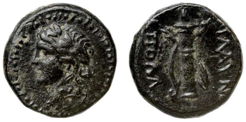 | RPC 3059 | Nero. AE19 of Blaundos, Lydia. 51-54. Magistrate Kalligenos. NEΡΩN KAIΣAΡ, bare-headed, draped bust right / TI KΛAY KAΛΛIΓENHΣ BΛAYNΔEΩN, Apollo standing right, holding lyre. BMC 63-65; SNG Righetti 1012; RPC I 3059; SNG vA 2925 (this coin); SNG Cop 85; Waddington 4915; Weber 6796; Mionnet IV 109; SNG Tuebingen 3675-3676; GRPC Lydia 99. | Text | Image |