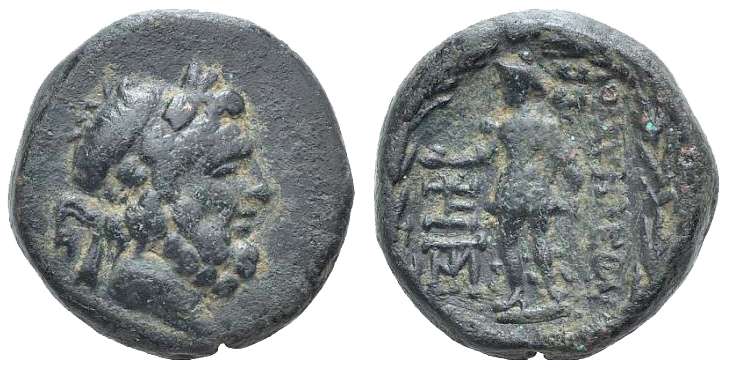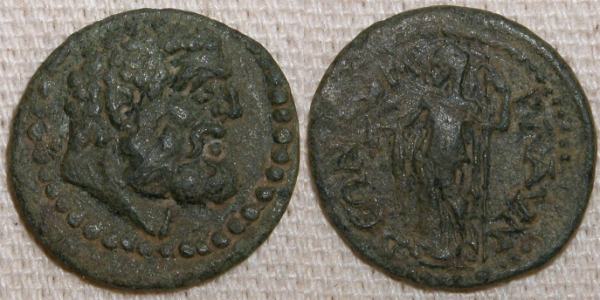 | SNG Cop 84 | Blaundus, Lydia. AE 20. 2nd Century BC. Bearded head of Herakles right within dotted circle / MΛAYNΔEΩN, Demeter, veiled, standing left holding sceptre and corn ears, all within dotted circle. BMC 59-60; Imhoof MG 7; SNG Tuebingen 3673-3674; SNG Cop 84; Mionnet Supp VII, 68 corr. (obv. description); GRPC Lydia 93. | Text | Image |