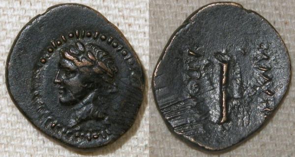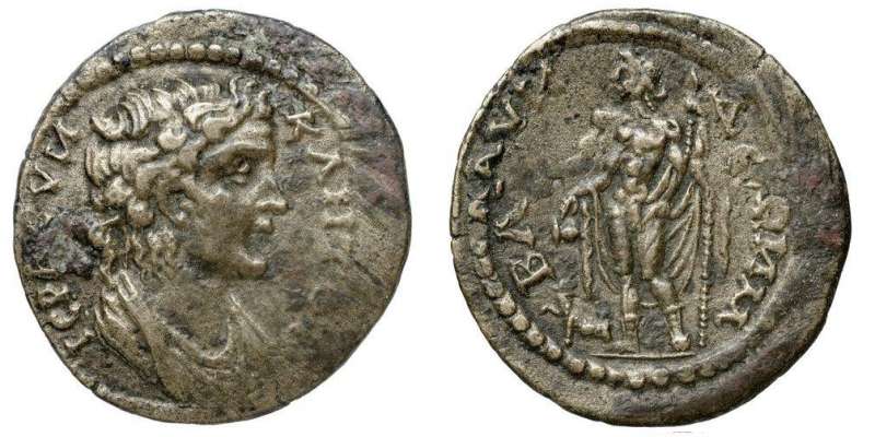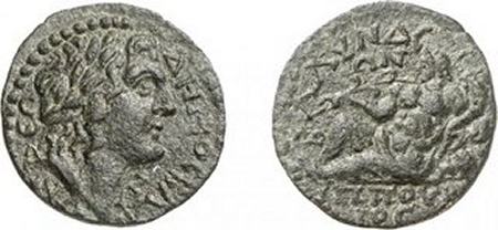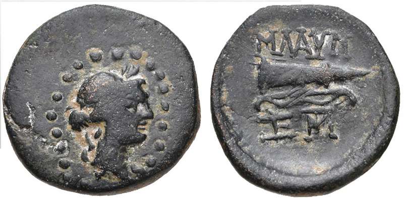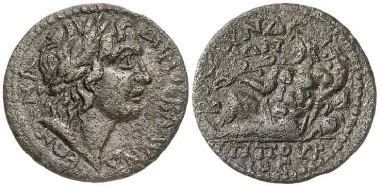 | RPC 3060 | Nero, AE15 of Blaundos, Lydia. 51-54. Magistrate Kalligenos. NEΡΩN KAIΣAΡ, bare-headed, draped bust right / KAΛΛIΓENHΣ BΛAYNΔEΩN, four grain ears bound together. RPC I 3060; BMC 66-68; Paris 179-180; SNG Munich 88; Waddington 4916; GRPC Lydia 100. | Text | Image |