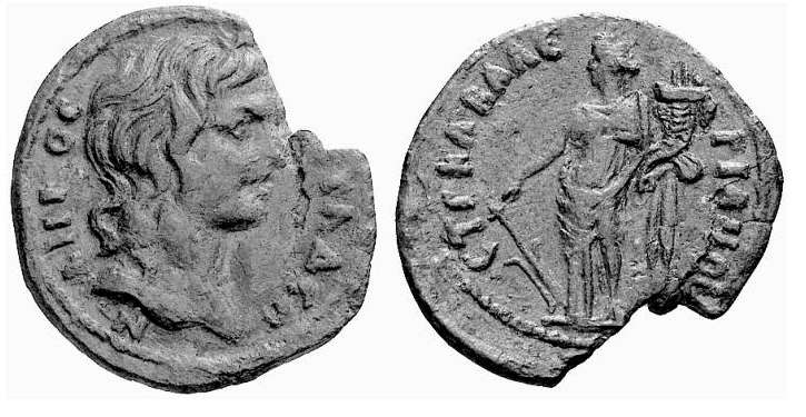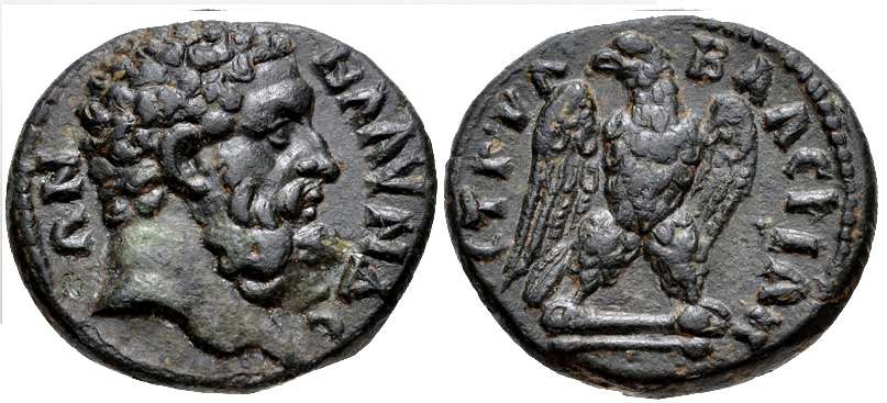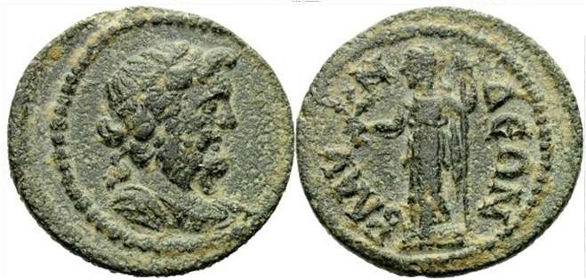 | Leypold I, 924 | Septimius Severus, AE 30, 12.63 gr. of Blaundus, Lydia. AY KAI Λ CEΠ CEOYHΡOC ΠEΡ, laureate head right / BΛAYNΔEΩN MAKEΔONΩN, Apollo Kitharoidos, radiate, in long robe, standing right, holding lyre and plectrum. BMC 79; Leypold I, 924 (obv. legend corrected in Leypold II); (All Ns retrograde); GRPC Lydia 118. | Text | Image |