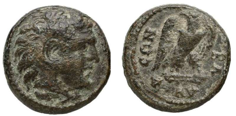 | BMC 41 | Blaundos, Lydia, AE19, semi-autonomous. 120-276. Head of Herakles right, wearing lionskin headdress / BΛAYNΔEΩN, eagle standing front on double bone, head left, wings spread. BMC 41; SNG Cop 74; Imhoof LS 6; GRPC Lydia 53. | Text | Image |