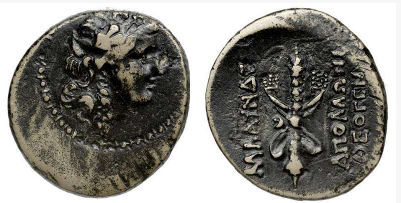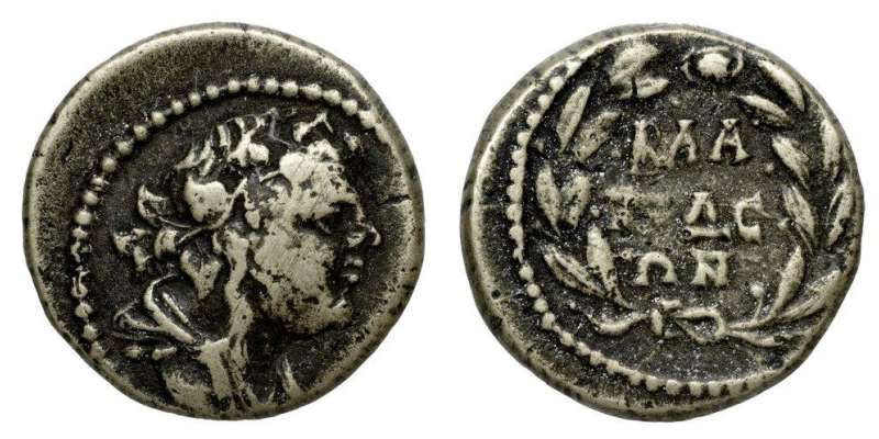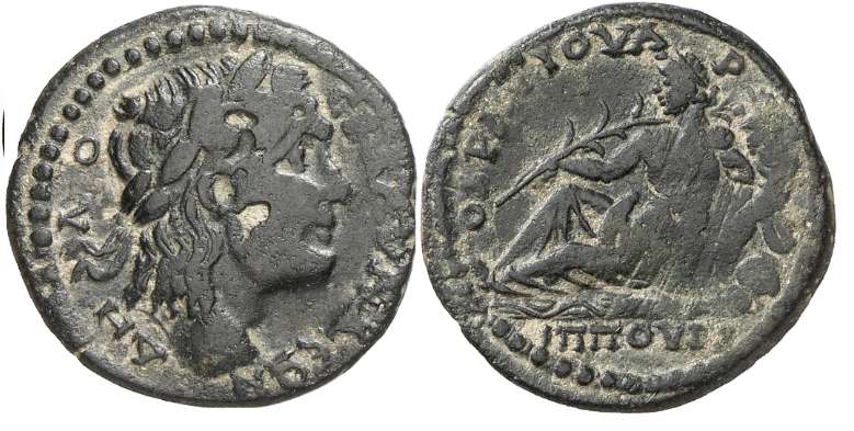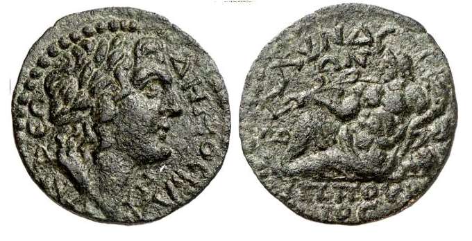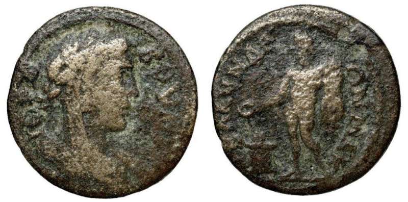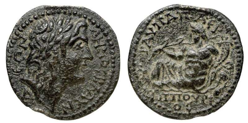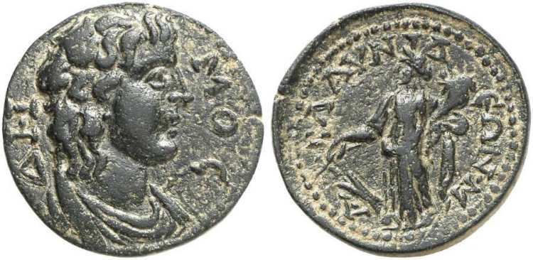 | RPC 1347 | Vespasian, AE24 of Blaundos, Lydia. AD 69-79. Magistrate Ti. Claudius Phoinich. 11.23 g. OYECΠACIANOC KAICAΡ CEBACTOC (anti-clockwise from lower right), laureate head right. / TI KΛAYΔIOC ΦOINIX BΛAOYNΔEΩN MAKEΔONΩN EΠI ITAΛIKOY, Dionysos, loins draped long, standing front, leaning on column, holding bunch of grapes and thyrsos. BMC 70-71; Imhoof MG 9-10; SNG Cop 88-89; Stumpf 328-329; RPC II 1347; GRPC Lydia 103. | Text | Image |