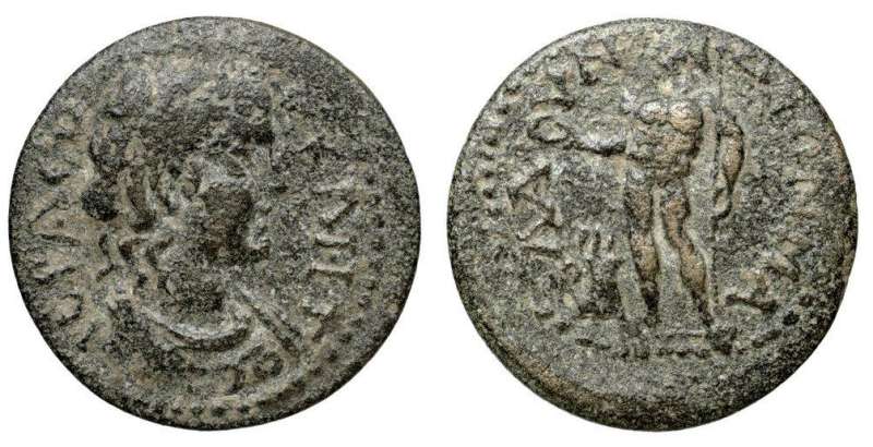 | RPC temp 25285 | Lucius Verus, AE33 of Blaundos, Lydia. AD 161-169. 16.25 g. Magistrate Cl. Valerianus. AY KAI ΛO AYΡH OYHΡOC, laureate, draped and cuirassed bust right. / BΛAYNΔEΩN CΛ KΛ B MAKEΔON, Herakles, naked, standing right, holding lionskin, wielding club, left knee on the back of the Nemean lion, which is sitting right with left paw raised. RPC IV.2 temp 25285; GRPC Lydia Supp. (planned) 116a. | Text | Image |