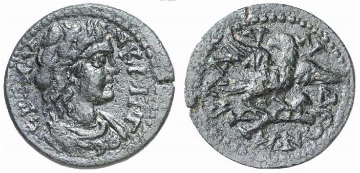| BMC 76 | Marcus Aurelius, AE31 of Blaundos, Lydia. 138-161. Magistrate Kl. Valerianos. AY KAI M AY ANTΩNINOC, laureate head right / CTRho; CΛ BAΛEΡIANOY BΛAYNΔEΩN, Apollo-Mên on horseback right, bipennis over shoulder. BMC 76; Paris 188-189; Vienna 37376; Leypold I, 922; Mionnet IV, 113; Plankenhorn 967; GRPC Lydia 112. | Text | Image |