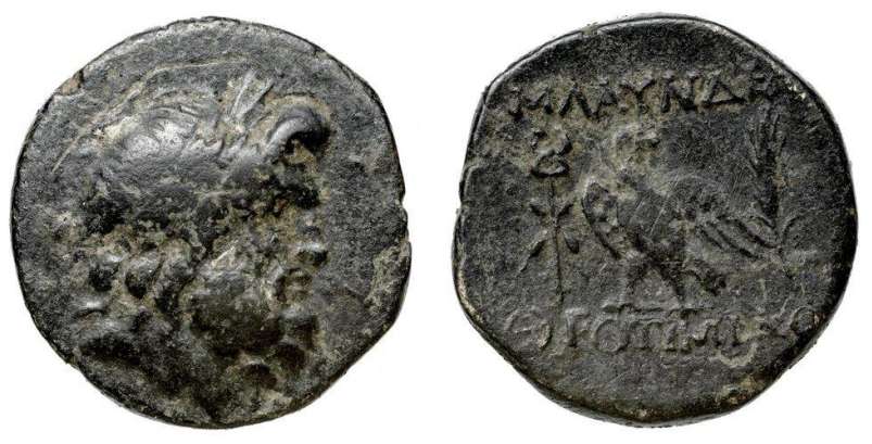 | Paris 142A | Blaundos, Lydia. AE20. After 200-0 BC. Magistrate Theotimidos. 7.63 gr. Laureate head of Zeus right / MΛAYNΔEΩ ΘEOTIMIΔO above and beneath eagle standing left, head right, wings spread; caduceus and corn-ear in fields. BMC 1-3; Waddington 4903; Paris 142A and 145; Walcher 2654 (misread as BΛAYNΔEΩ); GRPC Lydia 16. | Text | Image |
