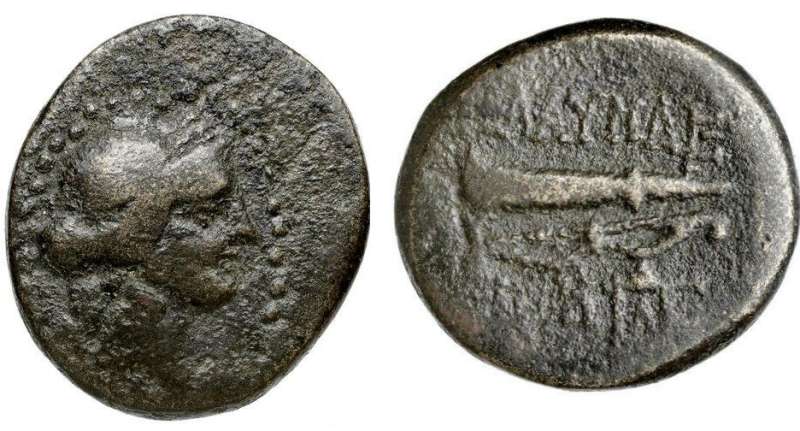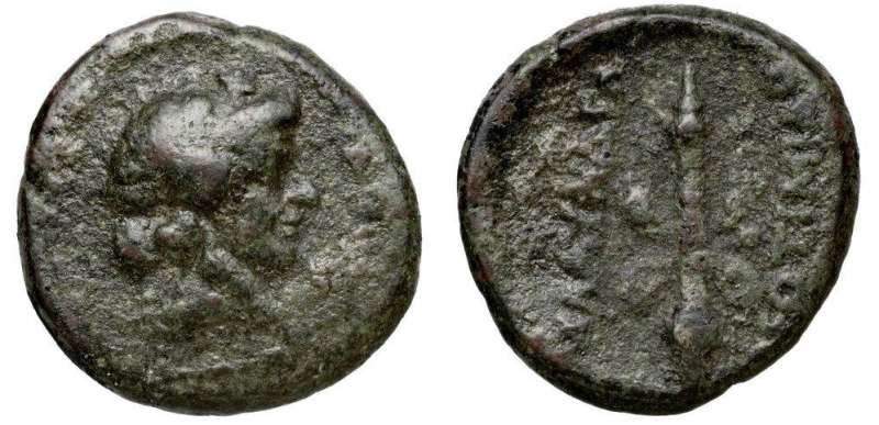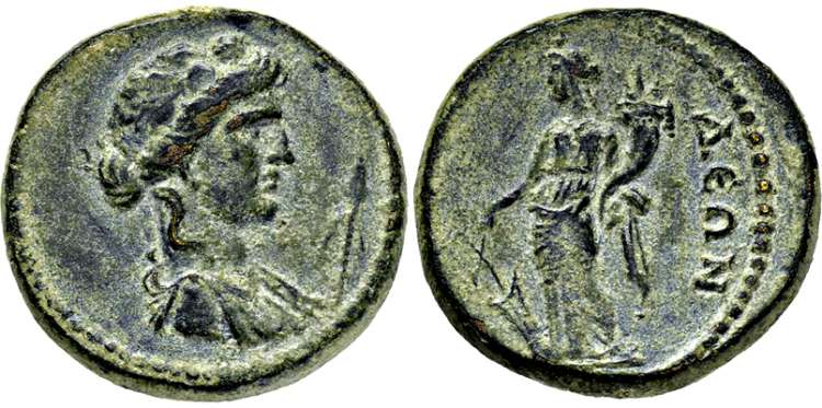 | SNG Cop 66 | Blaundus, Lydia. AE 18. 2nd Century BC. Laureate head of Apollo left / MΛAYNΔ-AΠOΛΛΩ, bow and quiver with strap. BMC 14-17; SNG Cop 66; Paris M3127; Imhoof MG 3; Sear GCV 4691; GRPC Lydia 1. | Text | Image |