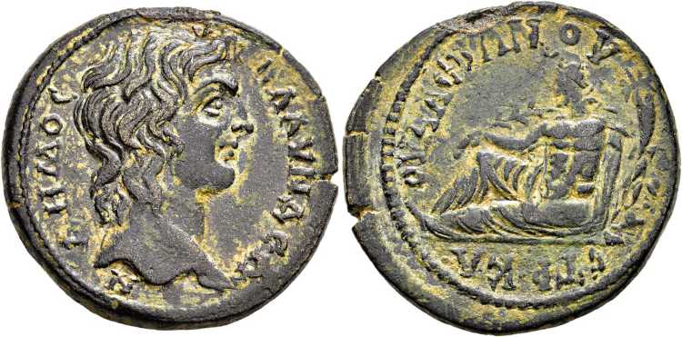 | Falter 448 | Philip II. AE 7.20 gr. of Blaundos, Lydia. 244-247 AD. M IOYΛ ΦIΛIΠΠOC KAICAΡ, bare-headed, draped bust right / BΛAYNΔEΩN MAKE, IΠΠOYΡIOC, river-god Hippurios reclining left, holding reed and cornucopiae, resting left arm on overturned urn, behind which is a fish swimming upwards. Falter Coll. 448 (this coin); GRPC Lydia 140. | Text | Image |