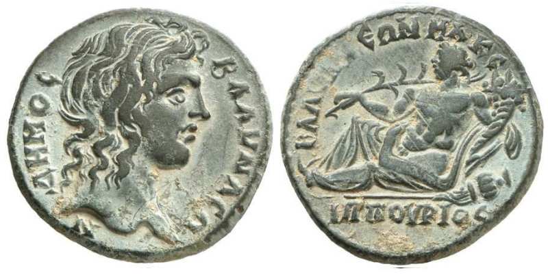 | Weber 6795 | Blaundos, Lydia. Pseudo-autonomous issue, AE, 240-260 AD. AD. 5.06 g. ΔHMOC BΛAYNΔEΩN, unbearded, laureate head of Demos right / BΛAYNΔE-ΩN in two lines at top left, IΠΠOYΡ-IOC below, river-god Hippurios reclining left, holding reed and cornucopiae, resting left arm on overturned urn. SNG Munich 84; SNG Lewis 1522; Weber 6795; Falter 446; Kurth Demos 524 and 533; RPC IX 734; GRPC Lydia 87. | Text | Image |