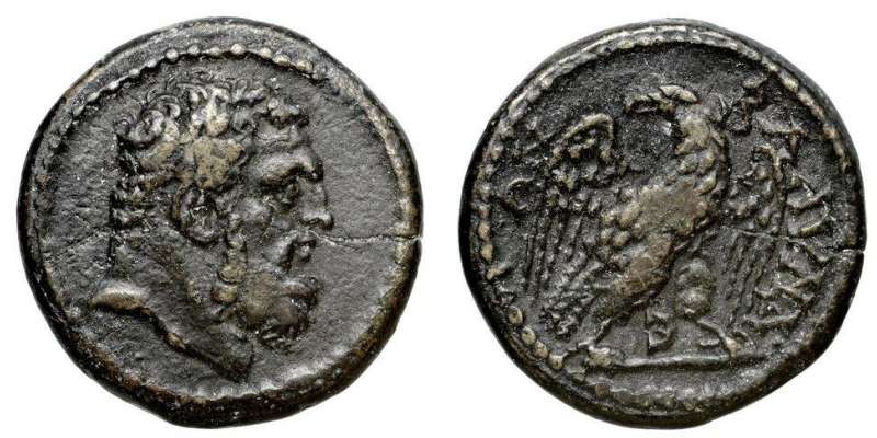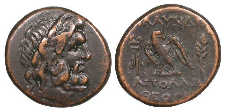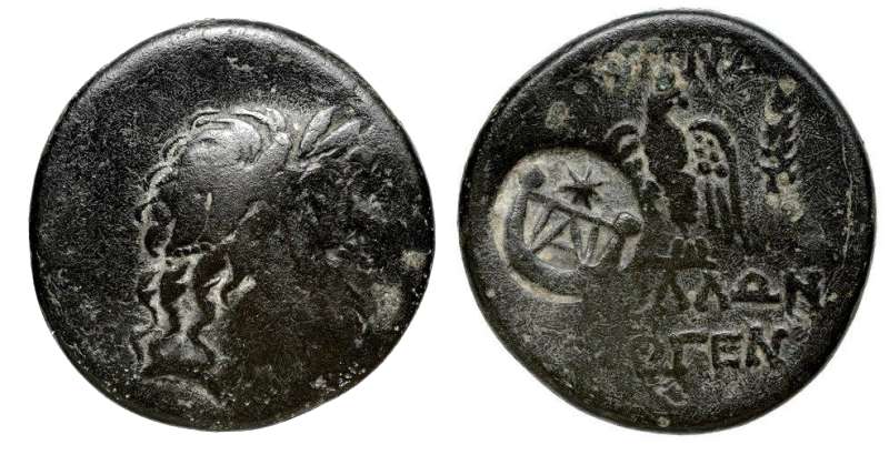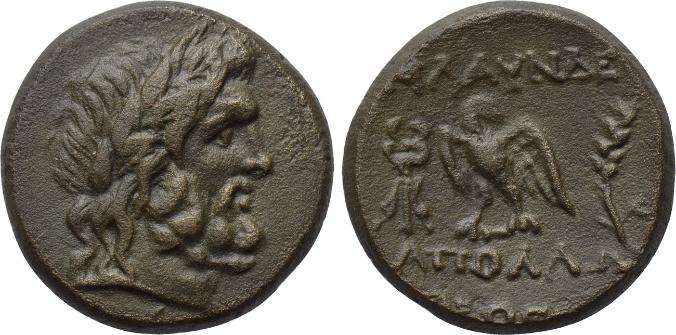 | BMC 6-10 | Blaundos, Lydia, civic issue, 200-0 BC. Magistrate Apolloni.. Theogen.. Laureate head of Zeus right / MΛAYNΔEΩN AΠOΛΛΩNI ΘEOΓENI, eagle standing left between caduceus and grain-ear, head right, wings spread. BMC 6-10; Walcher 2657; Waddington 4920; Winterthur 3711; GRPC Lydia 3. | Text | Image |
