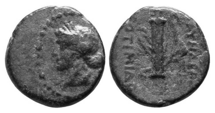 | Waddington 4906 | Blaundos, Lydia, AE18, Autonomous. after 200 BC. Magistrate Theotimido.. Head of Dionysos right, wreathed with ivy / MΛAYNΔEΩ ΘEOTIMIΔO, filleted thyrsos. Waddington 4906; Paris 155; GRPC Lydia 24. | Text | Image |