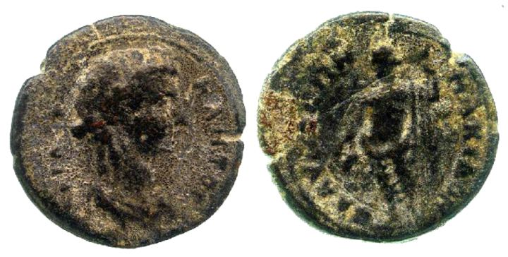| SNG Cop 92 | Sabina, AE of Blaundos, Lydia. 117-138 AD. 4.34 g. CABEINA CEBACTH, diademed, draped bust right / BΛAYNΔEΩN Demeter standing left, holding corn-ears and sceptre. SNG Cop 92; Weber 6798; Waddington 4920; Waddington, Voyages, (Lydia), 3; BMC 73; SNG Munich 90; RPC III 2450; GRPC Lydia 107. | Text | Image |